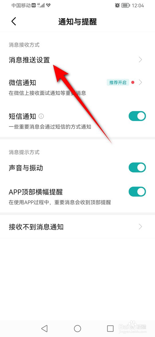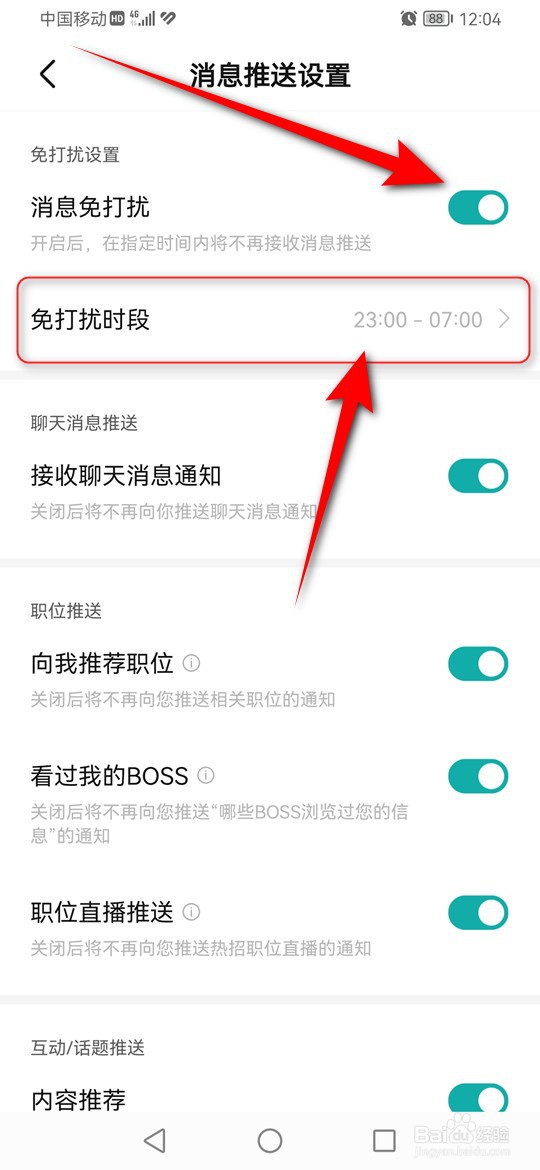 将“消息免打扰”旁的小滑块点亮并完成免打扰时段的设置即可在该时段不再接收消息推送,点击该小滑块。