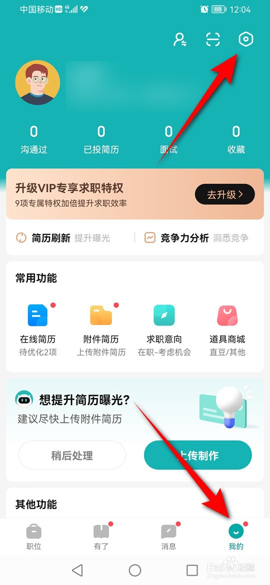 打开BOSS直聘“我的”页面,点击右上角的小齿轮图标进入。