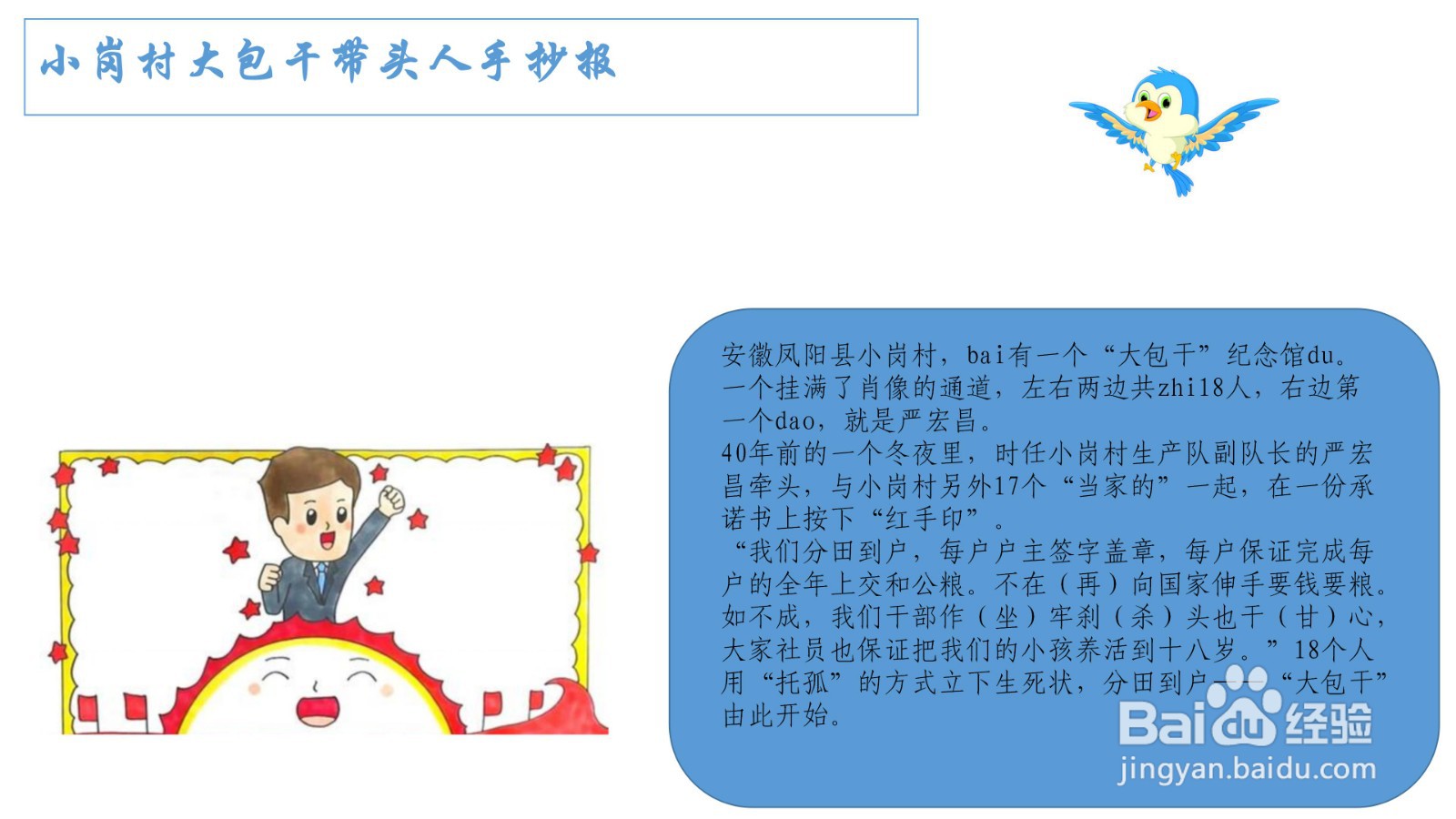 第三步,右上角画上小鸟的图案最为点缀,装饰“小岗村大包干带头人手抄报”画报。