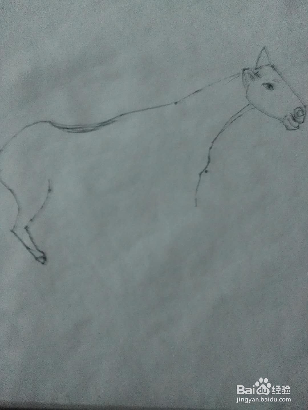 画出两只耳朵,它的耳朵就像两个三角型,从耳朵中间画出一条背部的轮廓线,注意弧度,在接近尾巴的时侯是先向下弯曲,在向上。