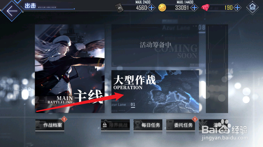 碧蓝航线玩家可以点击出击,点击进入大型作战玩法,在玩法地图中获得获得信标。