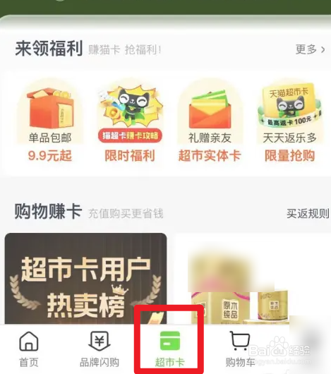 首先打开淘宝app,在天猫超市页面点击超市卡。