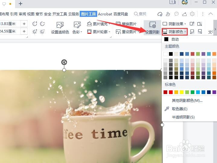 其次,选择“图片工具”,点击阴影颜色,进入颜色选择