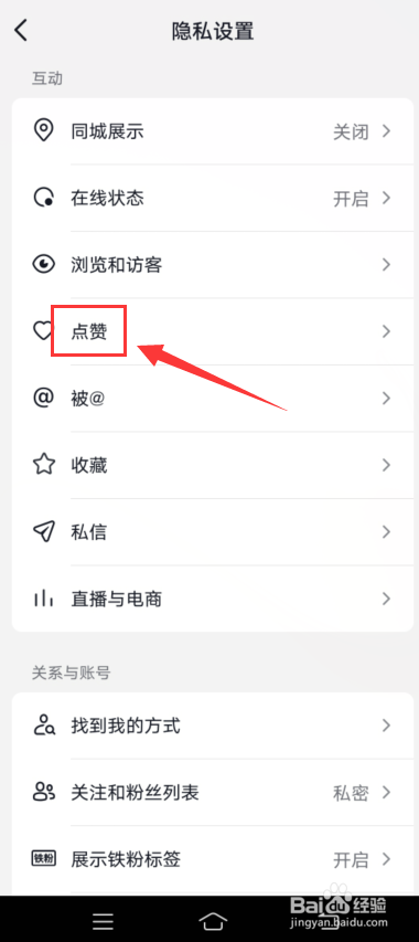 在隐私管理页面,可以找到【点赞】这个选项,我们点击一下