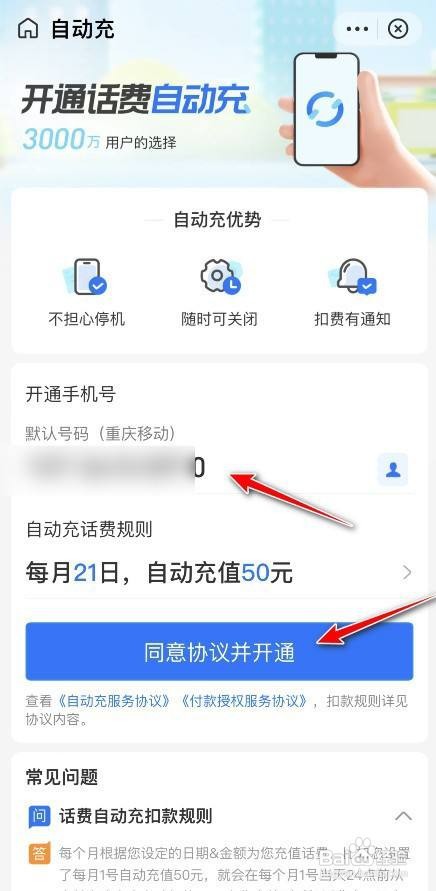 第三步、选择自动充值的手机号码、日期与金额,点击同意协议并开通即可。
