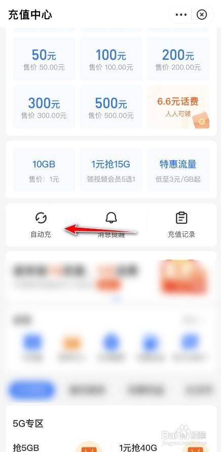 第二步、在充值中心的充值金额下方找到自动充,点击选择。