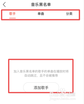 打开音乐黑名单就可以看到自己设置的黑名单列表了,包括歌手、单曲和分类的黑名单。