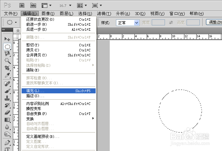 打开ps新建文件,点击椭圆选框工具并在舞台上画一个圆选区。