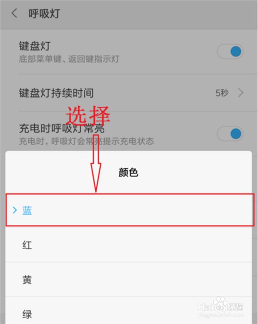 在弹出的小菜单中有七种颜色可以选择,红黄绿青白蓝紫,我们点击蓝色,手机呼吸灯处即闪烁一次蓝色灯提醒
