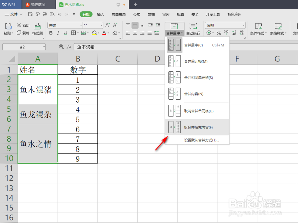 选择下拉菜单中的”拆分并填充内容“,如下图所示。