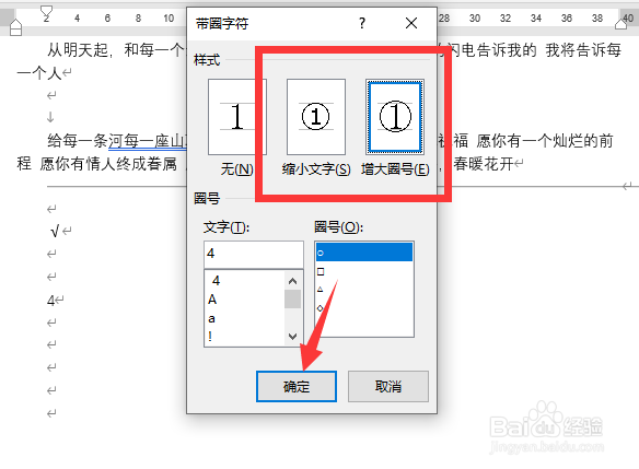 根据需要选择缩小文字或者增大圈号后,点击“确定”
