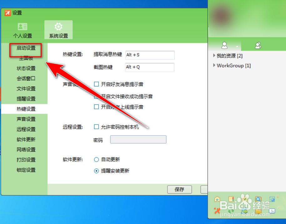 在“启动设置”窗口中,取消勾选“收到消息时自动弹出窗口”。