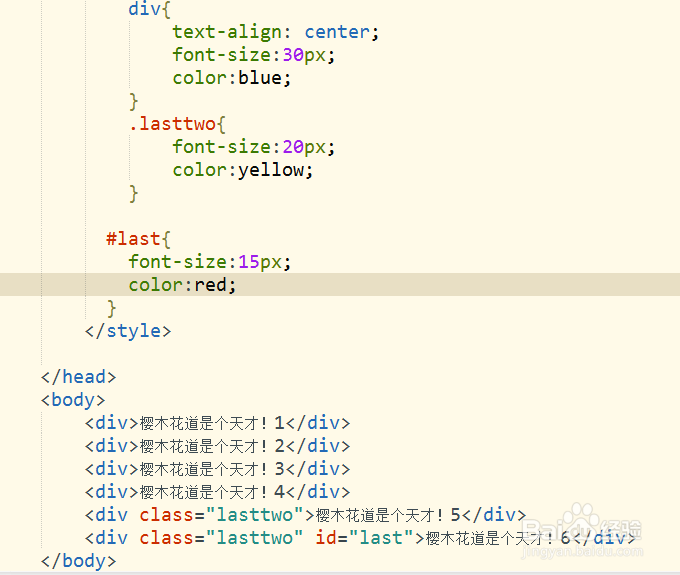 另外三个基础选择器它们可以同时作用于一个标签,但是当发生冲突时会有优先级的问题(比如下面是字体大小、颜色冲突)。