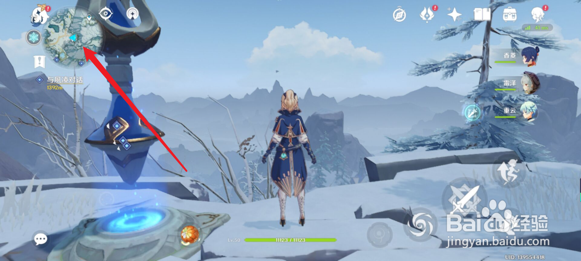进入原神游戏中,我们正在雪山,想要绕过雪山前往璃月,我们先点击左上角地图。