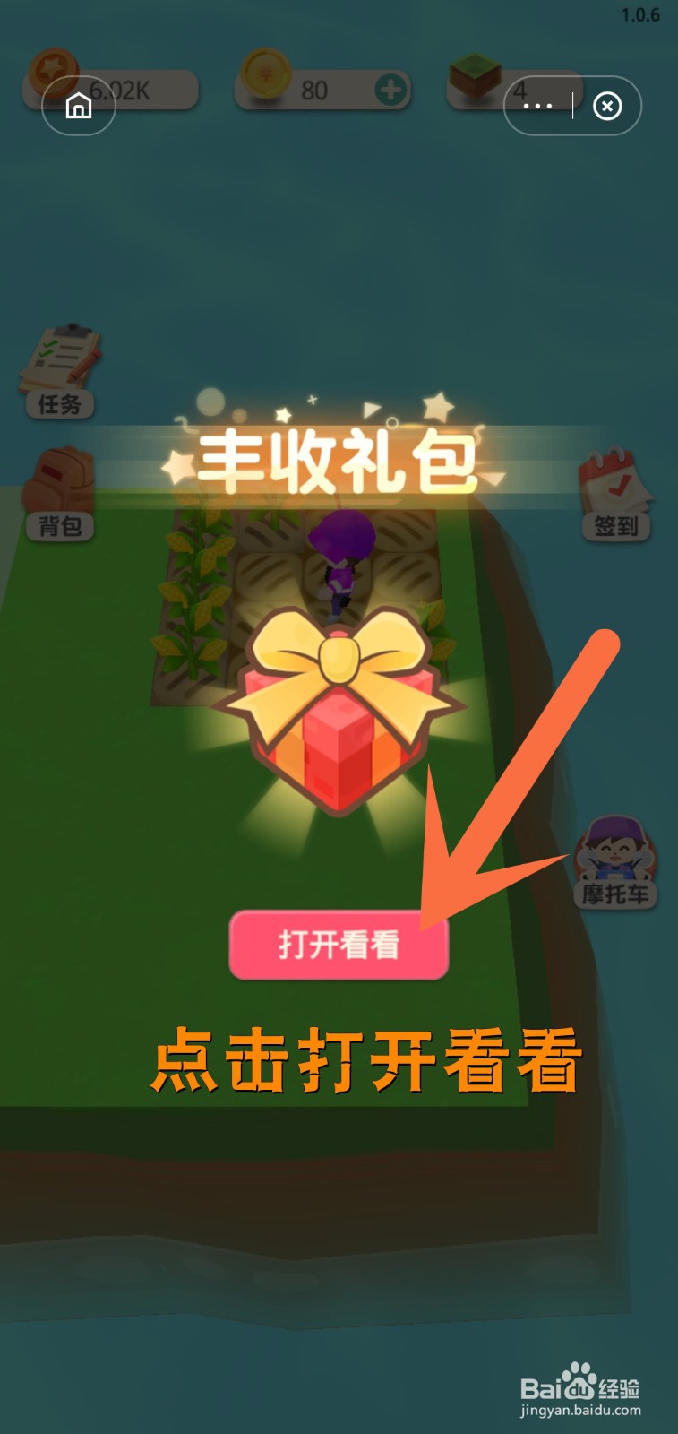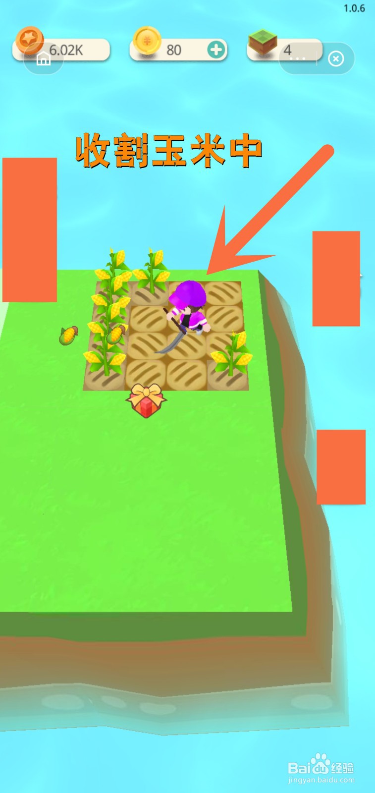 点击人物收割玉米,出现丰收礼包,点击打开礼包。点击打开看看,点击3倍领取金币,3倍金币领取成功自动存入。
