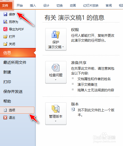 第一步:打开演示文稿,打开【文件】菜单,选择【选项】命令,如图: