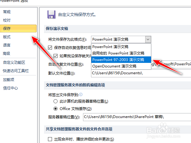第四步:从列表中选择【PowerPoint97-2003演示文稿】选项,然后点击【确定】并关闭【PowerPoint选项】,如图: