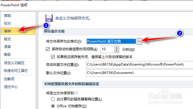 在PowerPoint中保存文件时,自动显示的格式为用户默认的保存格式,党默认保存格式并非常用格式时,可更改文件的默认保存格式,提高效率。