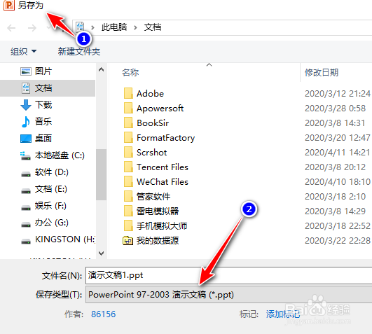 第五步:点击【文件】-【另保存】-可以看到设置完成后重新启动程序默认文件格式【PowerPoint97-2003演示文稿】,如图: