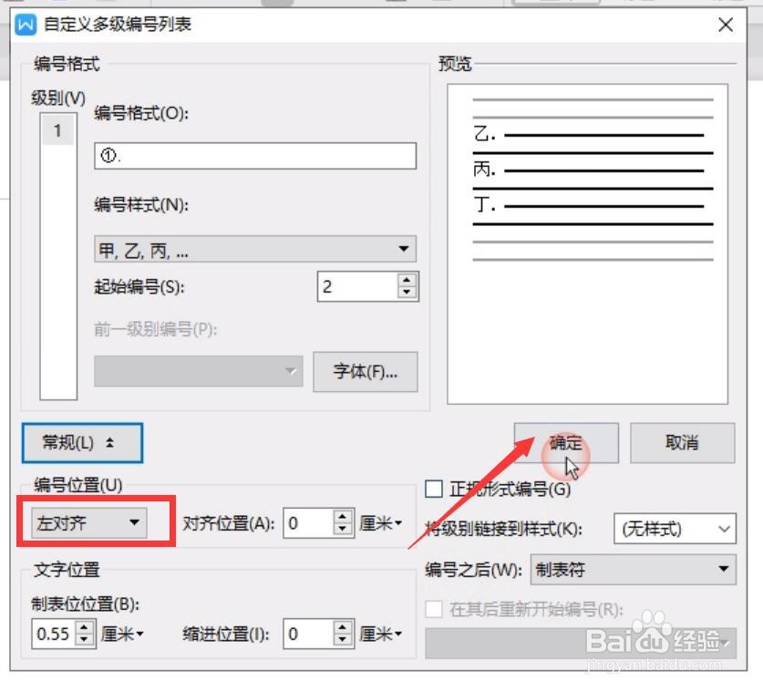 同时还可以针对编号的其它属性进行设置,如图所示,设置编号的对齐方式,点击”确定“按钮。