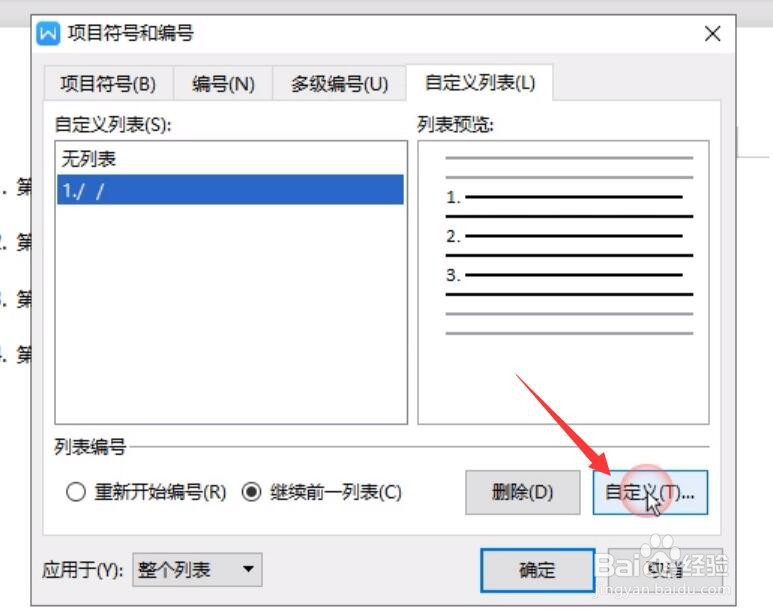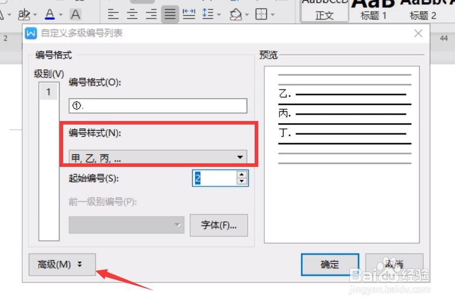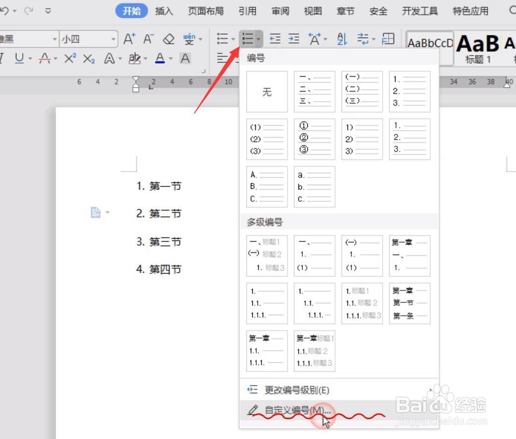 针对如图所示的系统默认的编号,如果想对其进行修改,我们可以点击“编号”下拉列表中的“自定义编号”项。