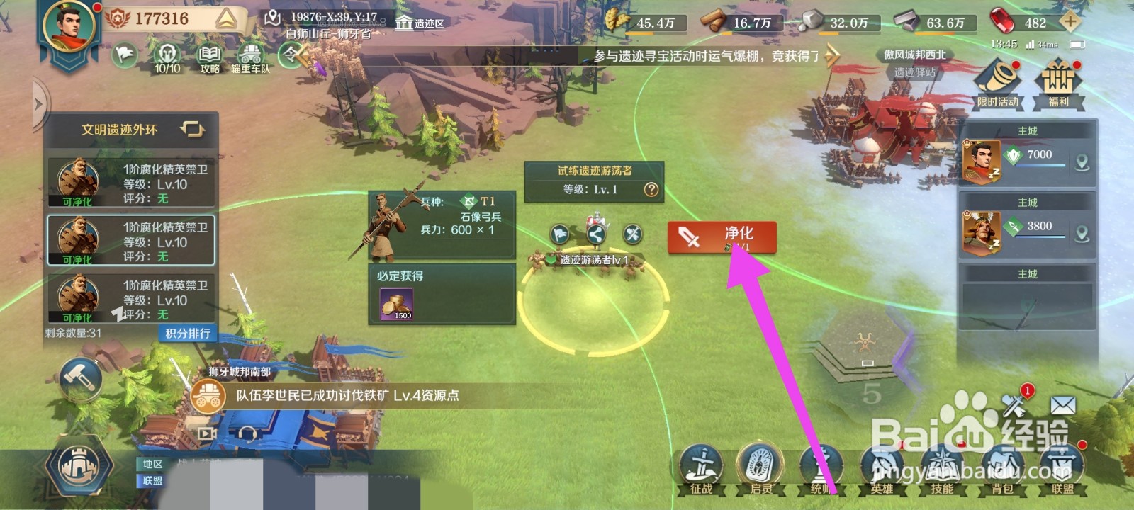 第四、在地图上找到试炼遗迹游荡者,点击“净化”;