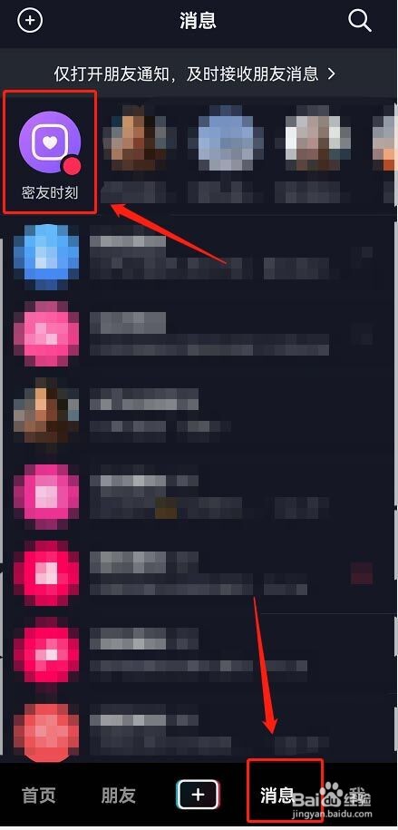 1、首先点击消息页面进入密友时刻。