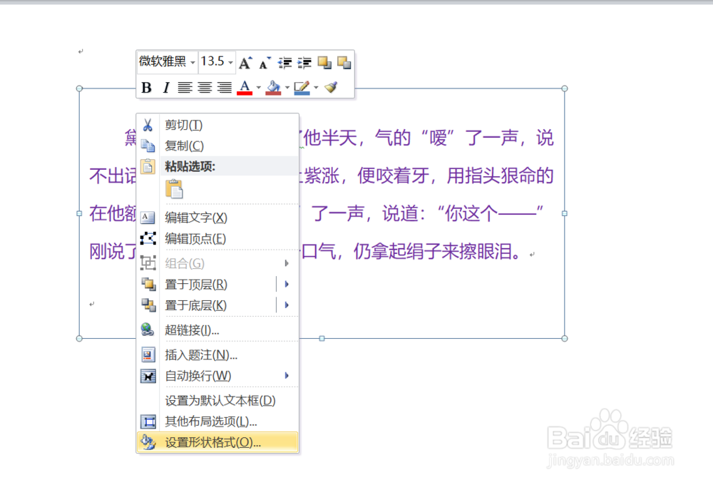 点击选中文本框,点击鼠标右键,在弹出的菜单选项中点击选择【设置形状格躲绵式】选项。