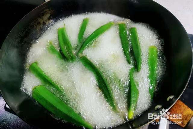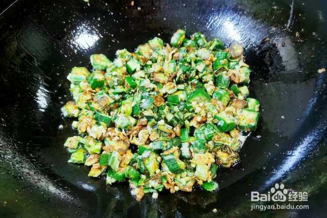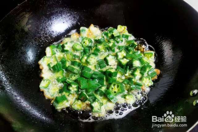 起炒锅,将裹好的秋葵倒入炒锅中,炒至鸡蛋液凝固。