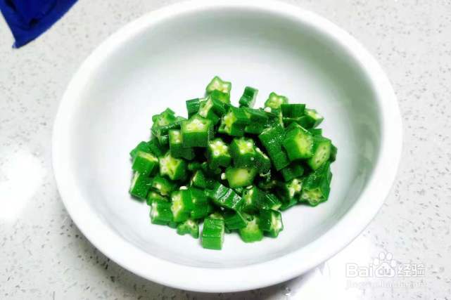 将控干水分的秋葵放在菜板上,改刀切成圈圈,装入碗中