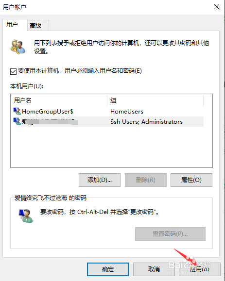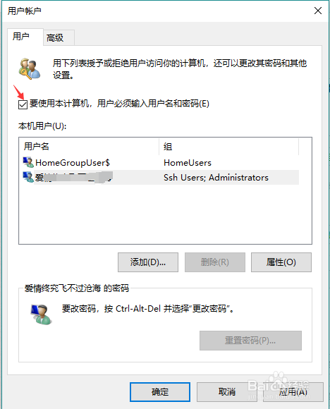 点击“要使用本计算机,用户必须输入用户名和密码”,在它前面复选框里打“√”