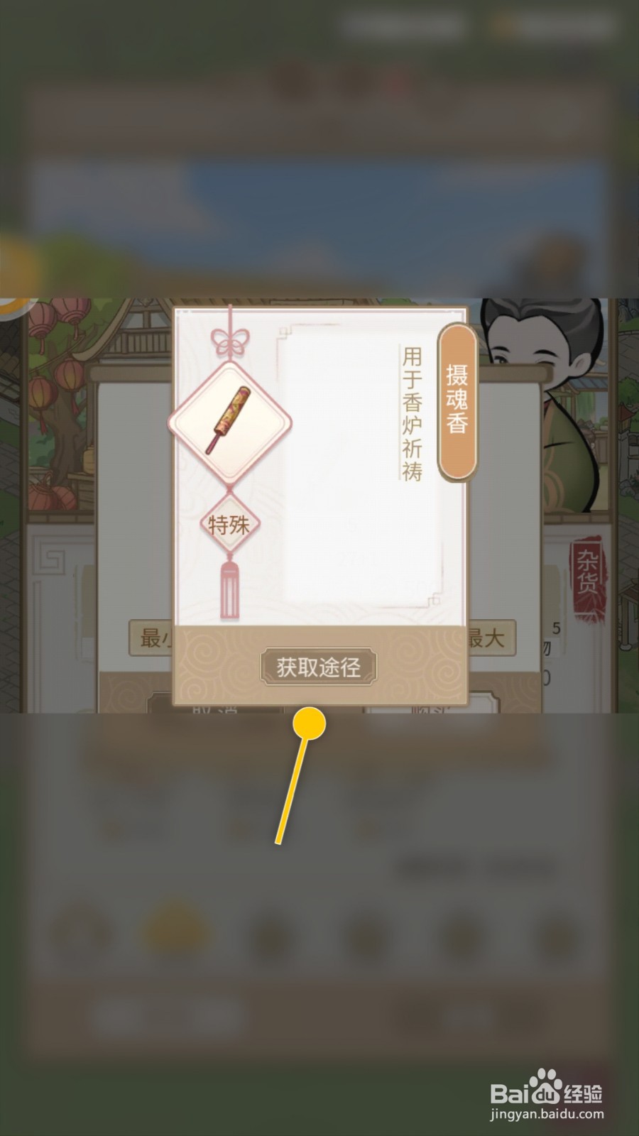 在“摄魂香”杂货详情中,选择“获取途径”选项。