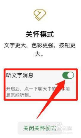 最后,我们在关怀模式的介绍页面中,点击并开启听文字消息功能,即可让微信自动阅读文字了