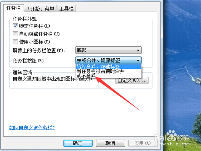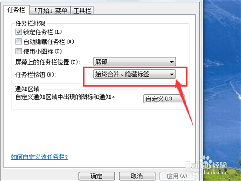 在【任务栏按钮】一栏儿中,点击一个向下的倒三角箭头,如图所示。
