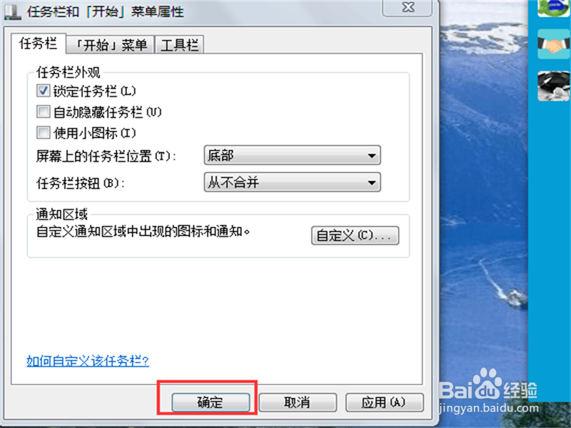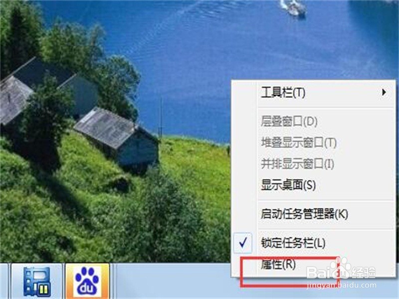 首先把你的鼠标箭头放在任务栏上,右键点击你的鼠标,会弹出一个菜单,选择菜单中的最后面一项【属性】字样按钮。如图所示。