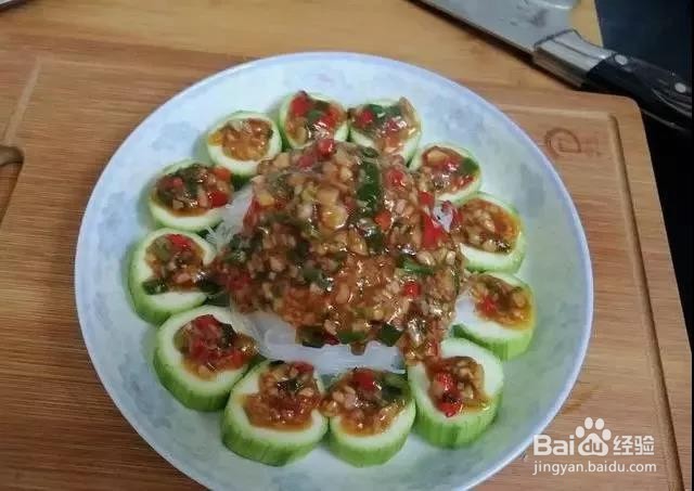 第三步,把洗好的丝瓜,放在案板上,用刀切成圆柱形,摆放入盘中。把泡发好的粉丝,摆放在丝瓜中间;