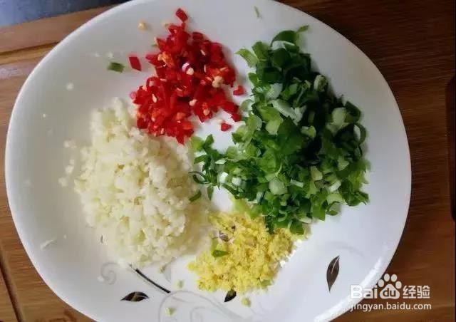 第四步,将葱洗净切末,红辣椒洗净切末,大蒜剥去外皮洗净切末,姜洗净切末;