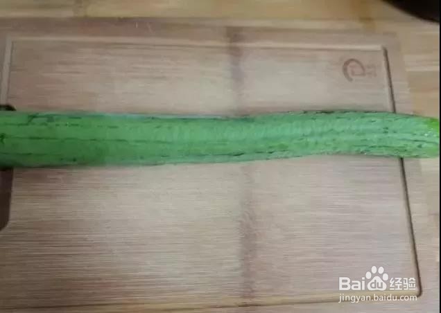 第二步,准备新鲜的丝瓜一根,用削皮刀削去外皮,用清水冲洗干净;