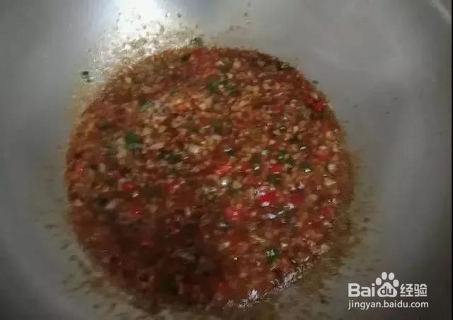 第六步,锅中提前预热加入少许的油,油温八成热时,放入葱,姜,蒜出炒香味,再放入红辣椒翻炒均匀后,倒入调料汁,在加入少许的盐,十三香,鸡精搅拌均匀,熬至汤汁粘稠;