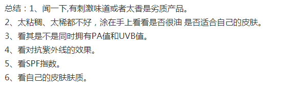 第五、看SPF指数。具体来说,日常室内使用可以挑选“SPF15-20”“PA+至PA++”的产品,户外活动时可以挑选“SPF25-30”“PA++至PA+++”,而在海滩边玩则要选“SPF30+”“PA+++”的。