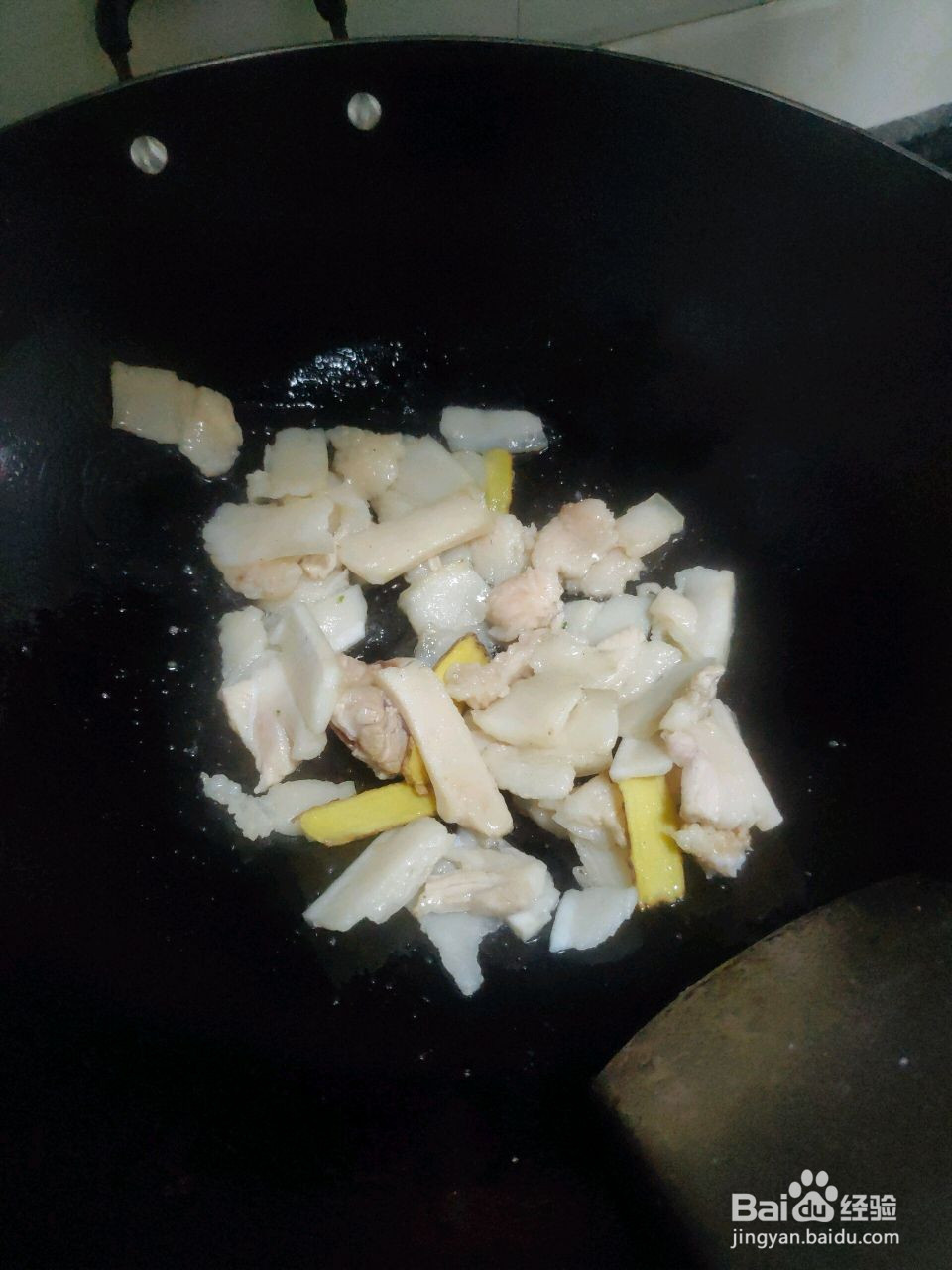 中小火煸炒出油,可以明显看到猪肉变薄了,如果油很多可以铲出一些,但要比平时炒菜多一些