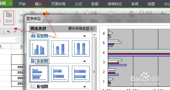 第三步,选择菜单栏上【插入】-【图表】,然后再选相应的图表类型,这里我们选择条形图。