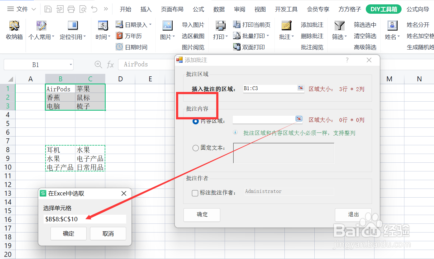 在弹出一个“添加批注”的窗口,在批注内容内选择内容区域,在本例中我们选择B8-C10。