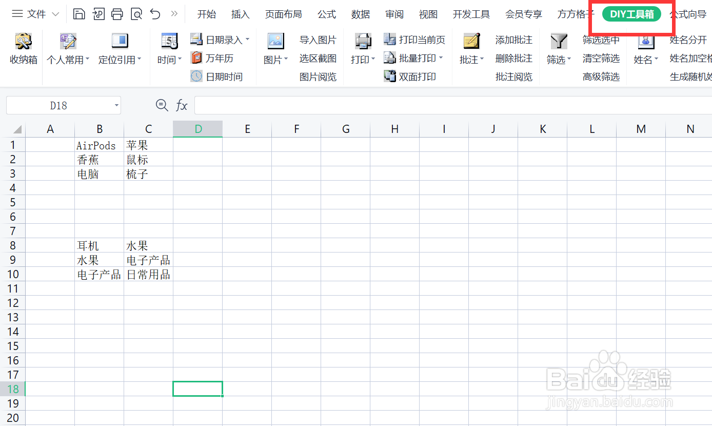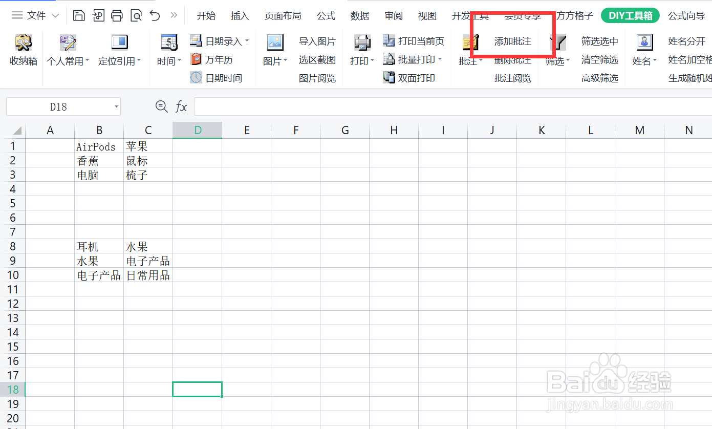 若我们想快速利用DIY工具箱快速在Excel中根据文本区域一一对应添加批注,将我们可以这么做。选择“DIY工具箱”这个插件。