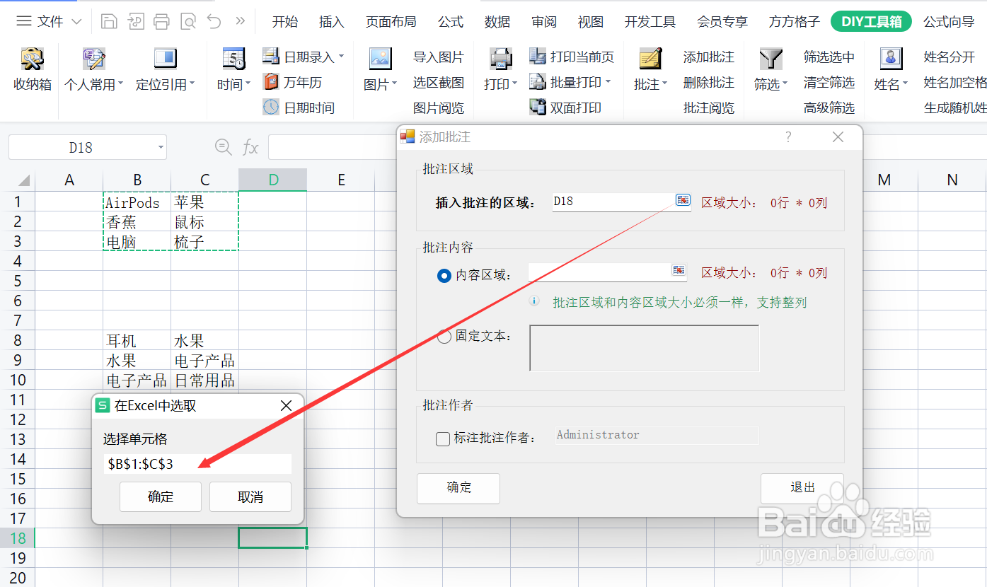 随后弹出一个“添加批注”的窗口,在批注区域内选择插入批注的区域为B1-C4。