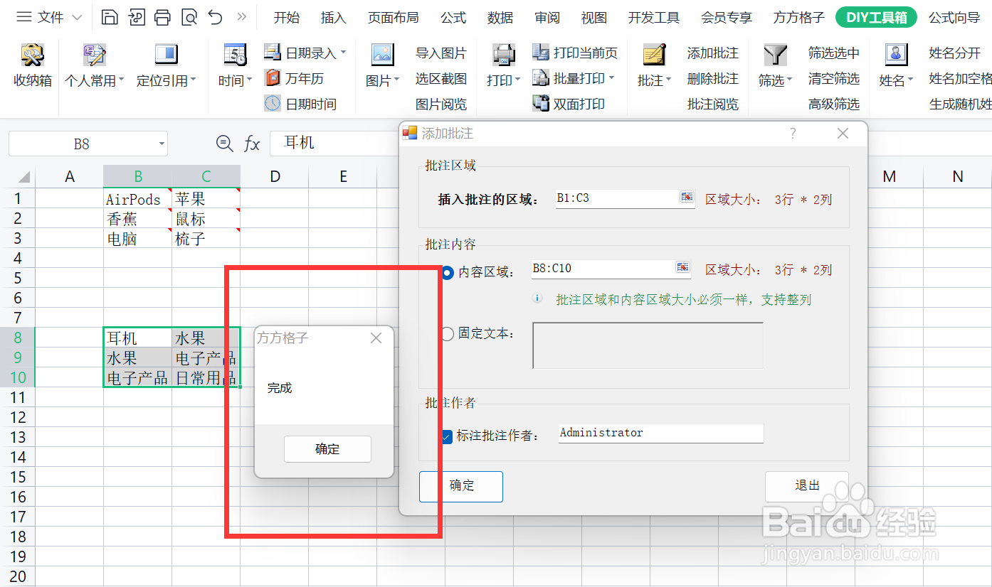 点击确认后,B8-C10的文本内容批注就插入完成。