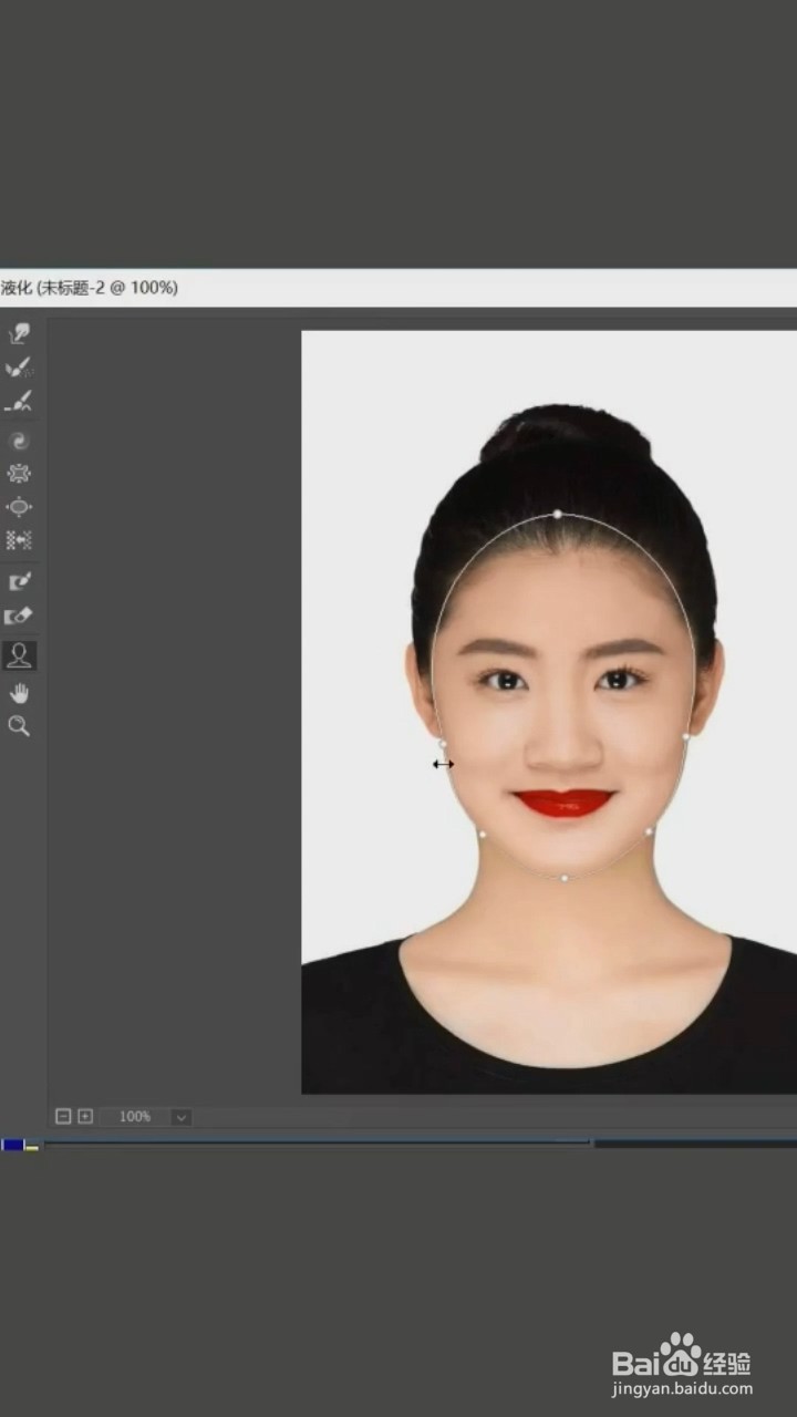 然后点击脸部工具按钮,进行脸部调节,首先收缩一下脸型,嘴唇,鼻子,然后拉长眼睛,把额头向上拉。点击确定,即可完成。