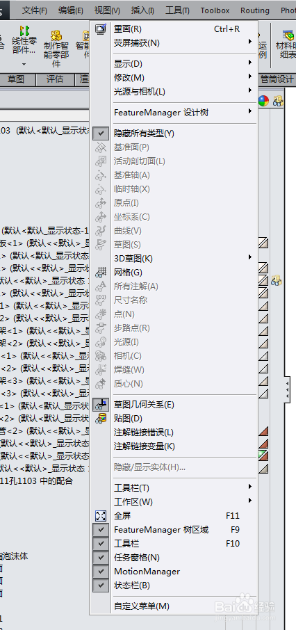 使用SolidWorks时,有时会遇到某个装配体中,视图前导项目中的选项都是灰色,无法启用,无法观悦临时轴,基准面等等信息。下面就说一下解决办法