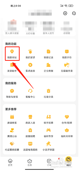 步骤一;打开美团外卖APP后,进入我的,点击(我的地址)选项。