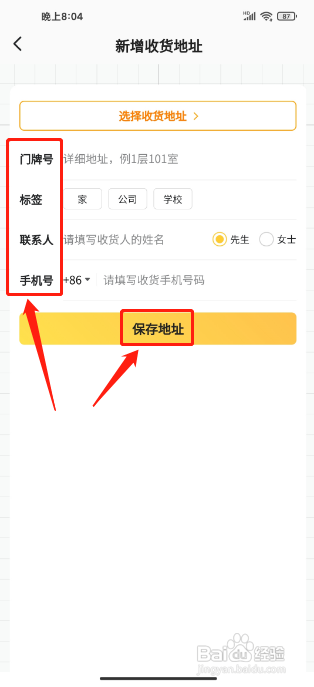 步骤三;进入新增收货地址,输入门牌号、标签、联系人、手机号,点击(保存地址)选项。